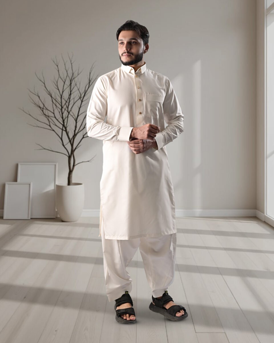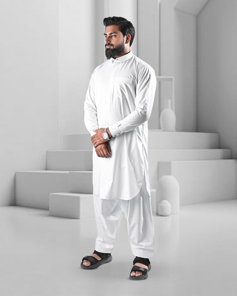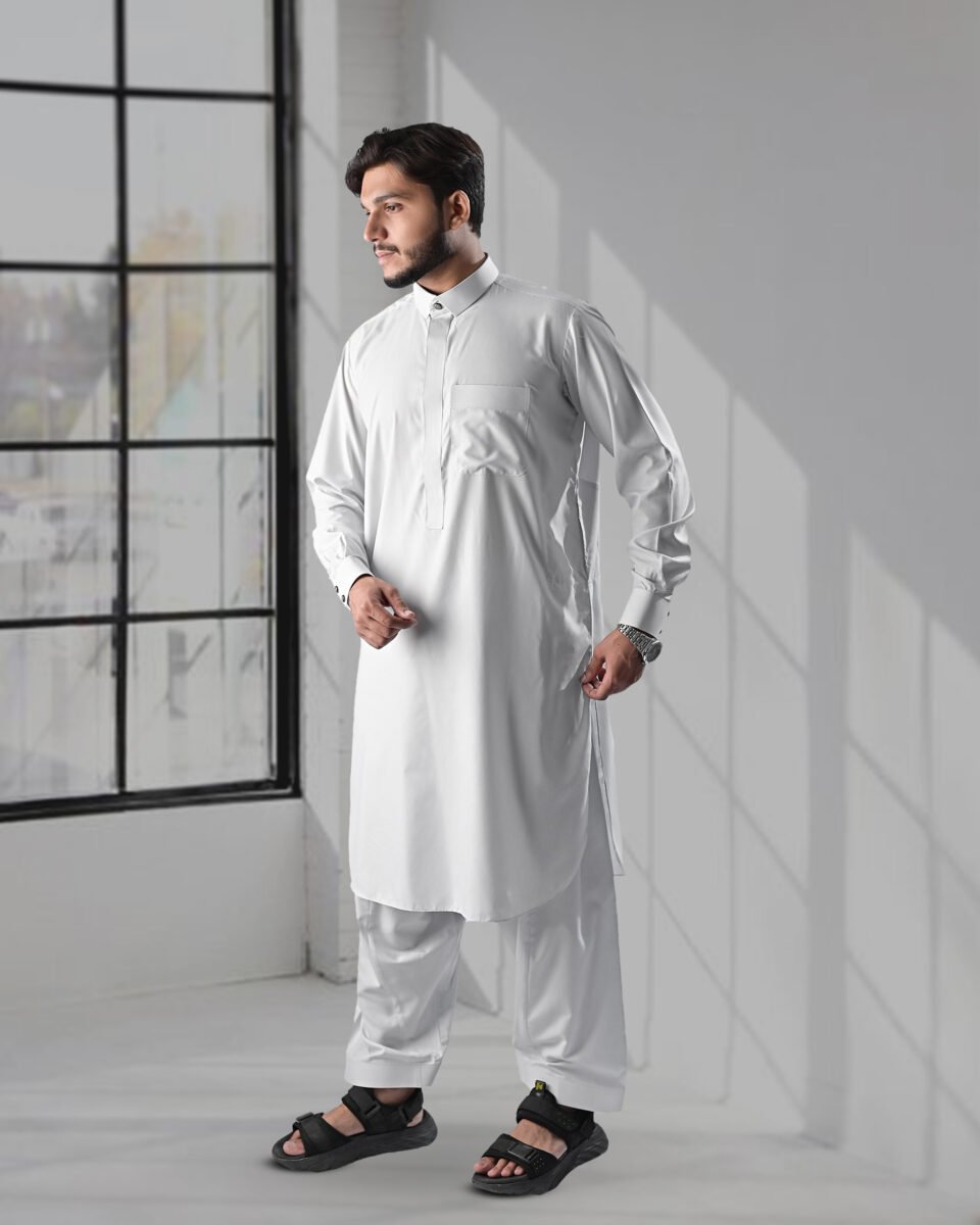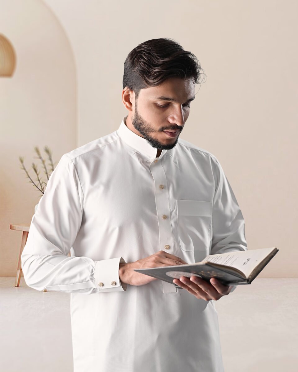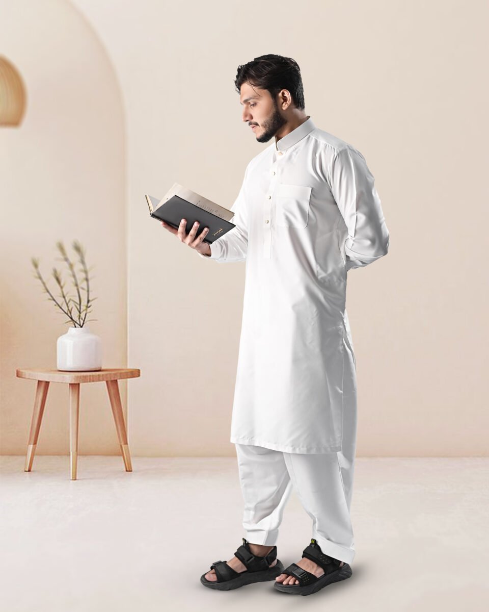 White Shalwar Kameez – Ban Collar with Black Buttons