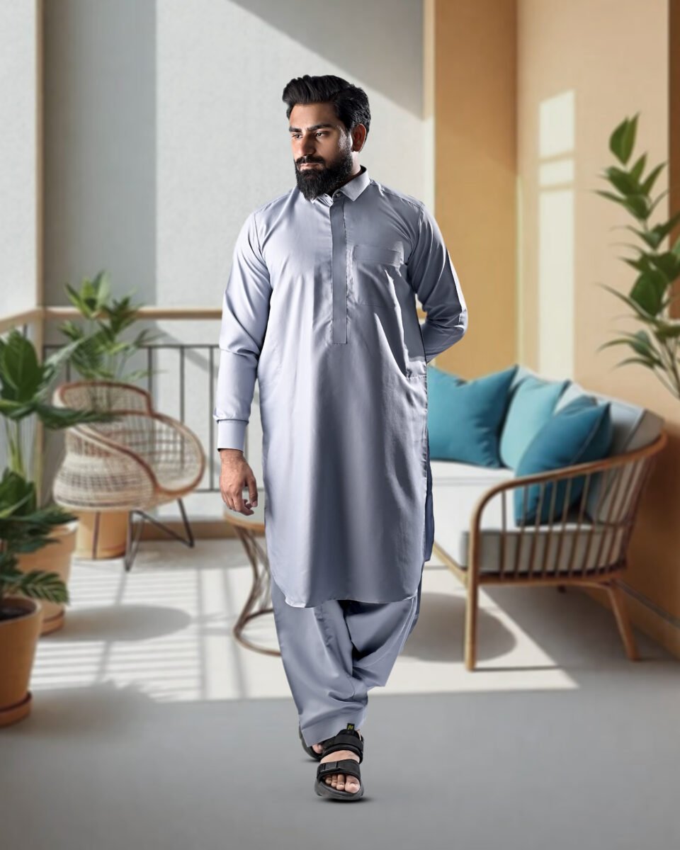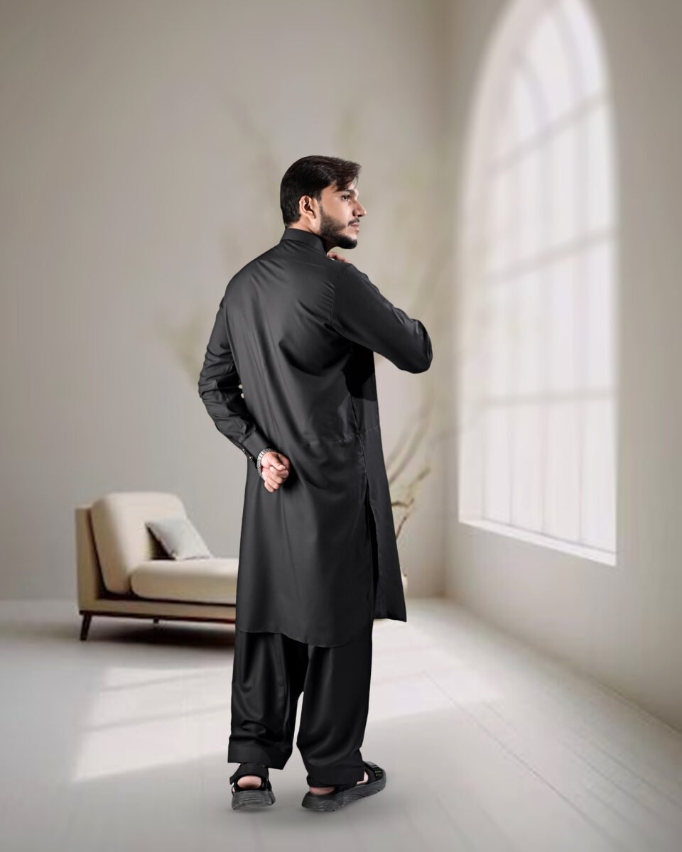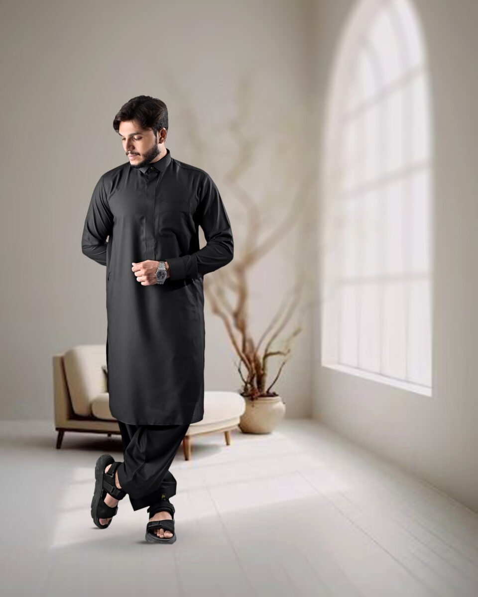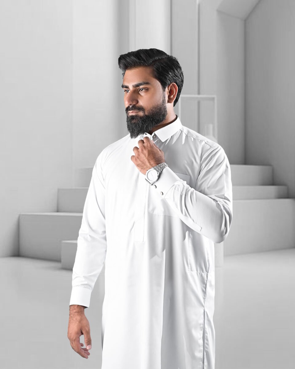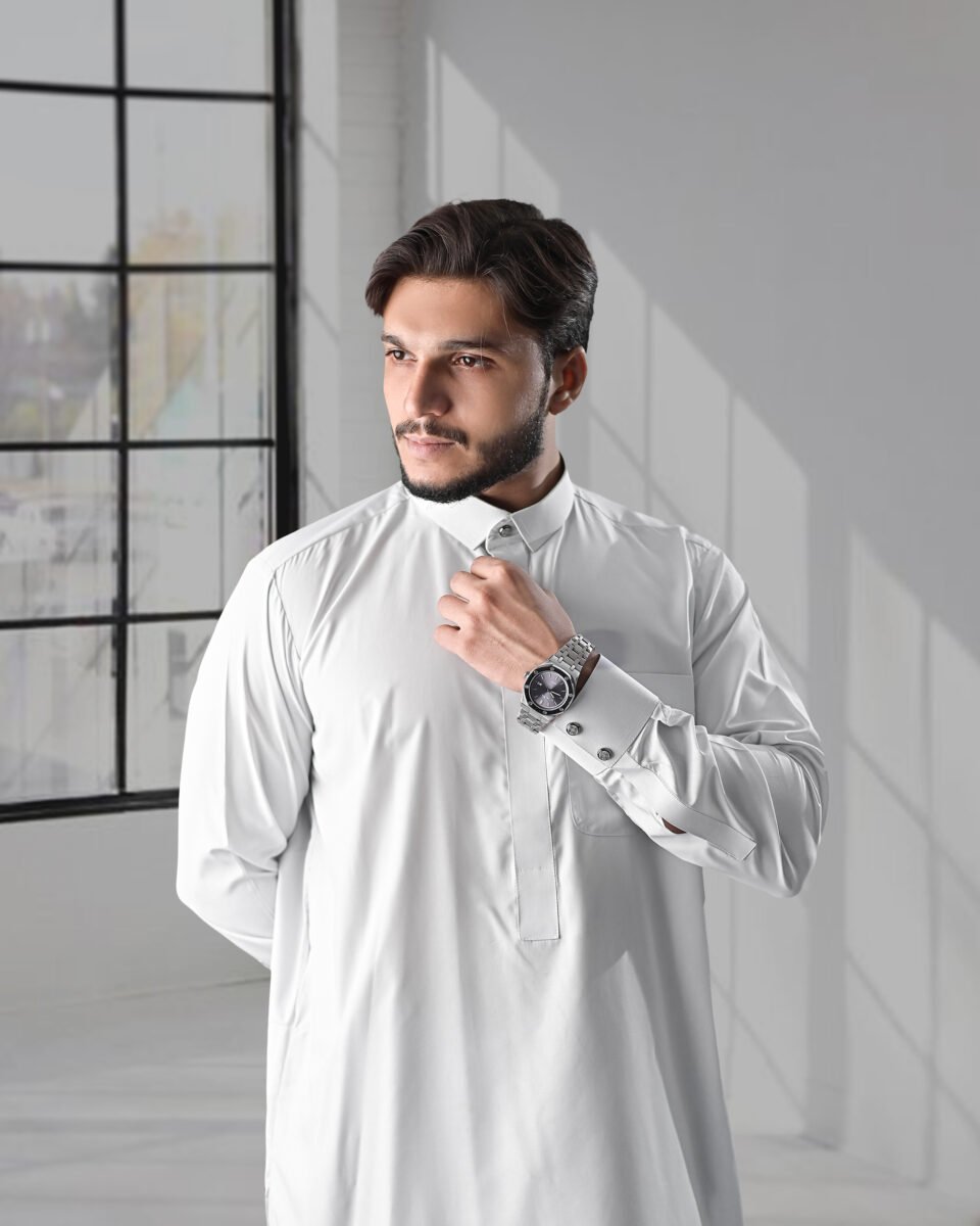 White Shalwar Kameez – Ban Collar with Black Buttons